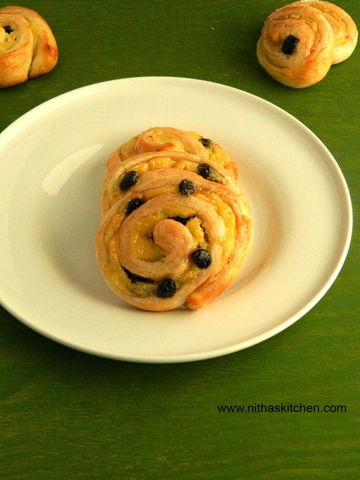 Coming to this month Swathi’s Baking Partners Challenge Kaveri has suggested Traditional Dutch Apple Pie and Dutch Coffee Bun recipes. I picked coffee buns which are very mildly sweeten yeasted buns, filled with pastry cream and raisins and finally glazed with strawberry jam. I was quite thrilled in baking these buns and also tasted so good. Here in the recipe neither cocoa nor coffee is used as an ingredient but usually these buns are served with cup of coffee for breakfast so they named it so. Thank you both for this wonderful recipe 🙂
